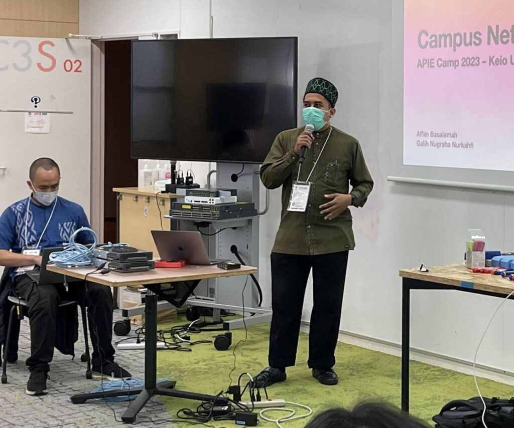 Noriatsu Kudo, the APIE program lead, introduced the camp schedule and all participants. Students started working on their mission of designing and deploying a small campus network and made their own UTP cable. Achmad Husni Thamrin, director of the AI3 project, explained about satellite services to connect to the Internet.