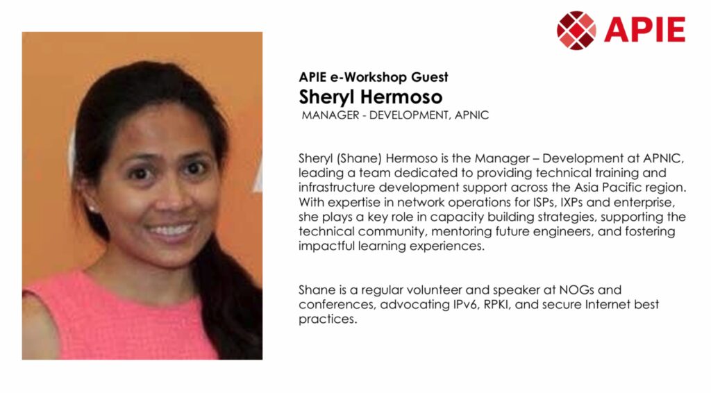 - Sheryl (Shane) Hermoso (APNIC), who explored the structure of the Internet ecosystem and pathways for engineers to participate in the technical community